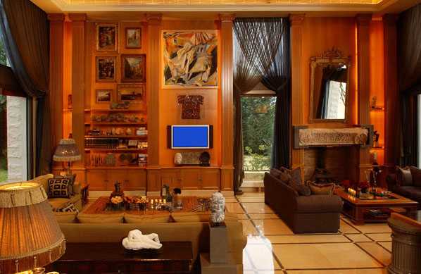 4 — Ведущий бежевый цвет в отделке стен хорошо сочетается с мебелью красного дерева и диваном. Темно-коричневый столик гармонирует с камином и кожаными креслами.