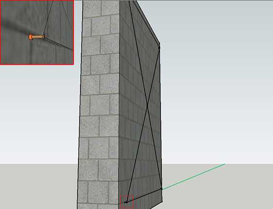 Дальше всё по накатанной. Засверлил в четырёх углах дюбеля и выставил одну из пар строго в вертикальном уровне, а дальше натянул по диагоналям полученного четырёхугольника шнуровку.