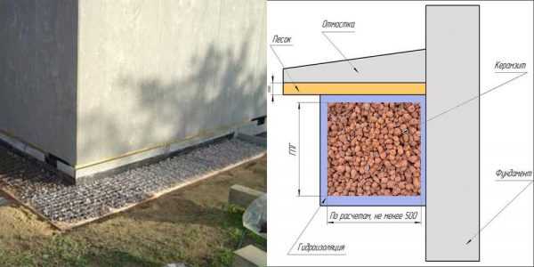 Керамзит также довольно качественный материал. Он дешев, просто насыпается в котлован возле фундамента, химически не активен, не боится влаги и перепадов температуры. Единственным минусом является сравнительно низкая эффективность – нужно насыпать толстый слой, чтобы обеспечить нужный уровень теплоизоляции отмостке.