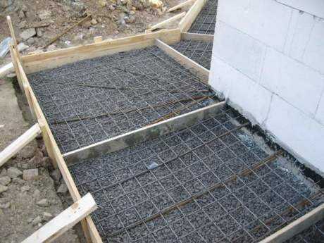 Для этого может применяться готовая сетка или ее варят своими руками по месту укладки. Обычно размер ячеек делается по размеру 150х150 мм. Соединения выполняют сваркой или применяют вязальную проволоку, в продаже имеются пластиковые хомуты. Сетка укладывается на подпорки, установленные из камней, кусков кирпича. От сетки до верха опалубки оставляют зазор в 1 см.