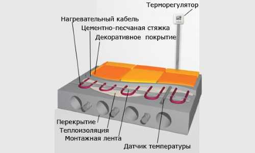 Такая система может служить как основным видом отопления, так и дополнительным. Принцип работы системы заключается в том, что тепло от подогреваемого пола равномерно распространяется до потолка. Нагревательные секции состоят из одножильного или двужильного кабеля, укрытого сверху напольным покрытием. Терморегулятор может быть встроенным, накладным или программируемым.