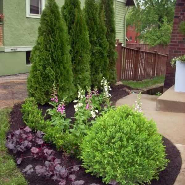 - Если палисадник расположен со стороны дома без окон, можно высадить компактные пирамидальные деревья.