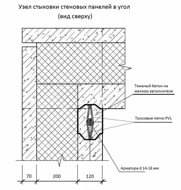 Соединение стеновых панелей между собой производится путем замоноличивания тяжелым бетоном мест стыковки внутреннего несущего слоя. Для связи стеновых панелей между собой на горизонтальных торцах несущего слоя с шагом 400-500 мм закладываются стальные тросовые петли финского производителя Peikko Group. При установке стеновых панелей рядом, тросовые петли соседних панелей пересекаются, образуя узел, в который вставляется арматура.