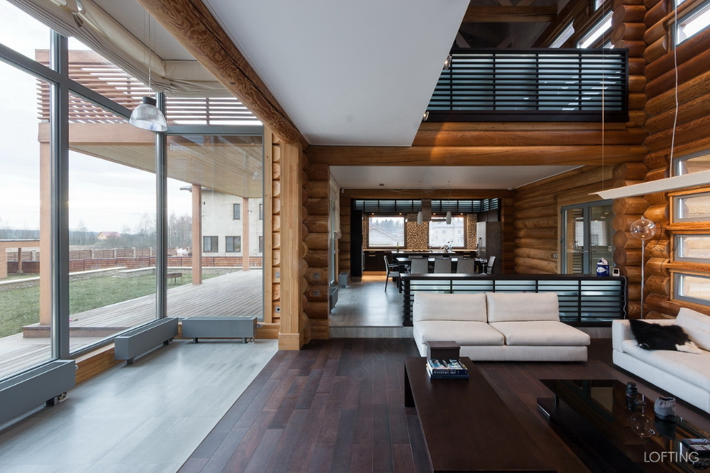 Остекление в проекте деревянного дома с большими окнами стало основным инструментом, связывающим жильцов с окружающей средой. Гостиная получила беспрепятственный вид сразу на две противоположные стороны здания.
