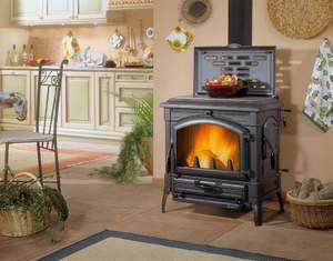 - Отопительно-варочные. Благодаря варочной плите на одну или две конфорки можно приготовить, разогреть пищу, вскипятить воду. Эти модели чрезвычайно удобны. Нередко в них установлены духовки. Пища в них получается с особым «домашним» ароматом и слабым привкусом дыма, как от костра. Духовки также используют для сушки фруктов, грибов, трав.