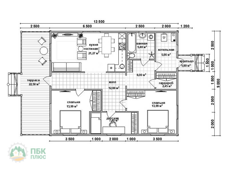 Проект одноэтажного дома размером 10 на 13 метров. В этом доме три спальни, котельная, два санузла и раздельные гостиная и кухня с выходом на террасу.