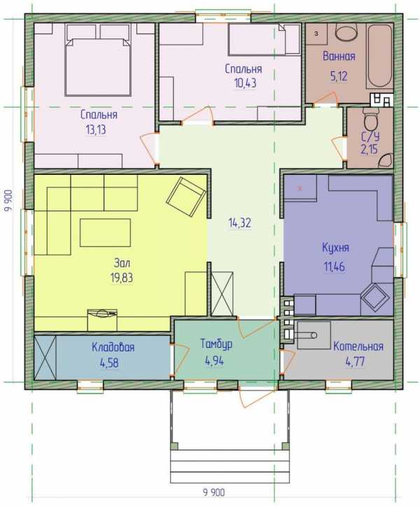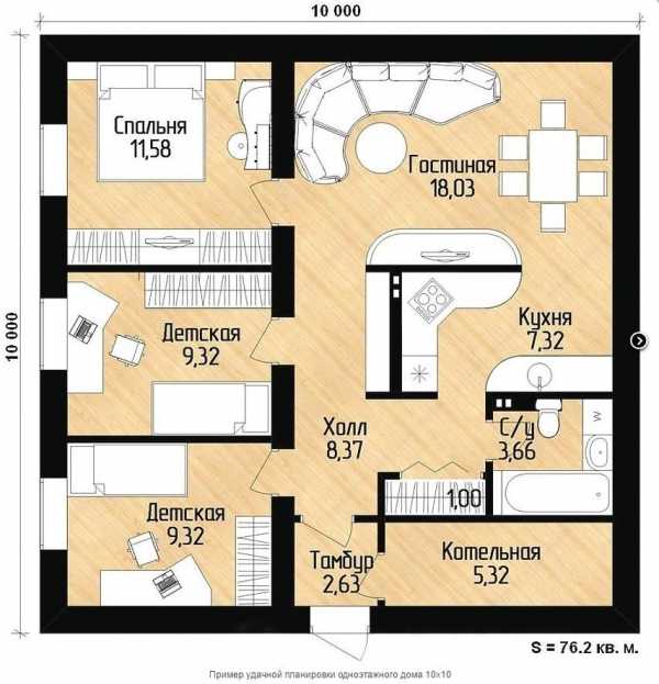 ΠΠ° ΡΠΎΡΠΎ Π½ΠΈΠΆΠ΅ ΡΠ΄ΠΎΠ±Π½Π°Ρ ΠΏΠ»Π°Π½ΠΈΡΠΎΠ²ΠΊΠ° ΠΏΠ΅Π½ΠΎΠ±Π»ΠΎΡΠ½ΠΎΠ³ΠΎ Π΄ΠΎΠΌΠ° Π³Π°Π±Π°ΡΠΈΡΠ°ΠΌΠΈ 10Ρ 10 ΠΌ. ΠΡ ΠΎΠ΄ Π² ΠΏΠΎΡΡΡΠΎΠΉΠΊΡ ΡΠ°ΡΠΏΠΎΠ»ΠΎΠΆΠ΅Π½ Π² ΠΏΡΠ°Π²ΠΎΠΉ ΡΠ°ΡΡΠΈ Π·Π΄Π°Π½ΠΈΡ, Π±Π»ΠΈΠΆΠ΅ ΠΊ ΡΠ΅Π½ΡΡ. ΠΠ· ΠΌΠ°Π»Π΅Π½ΡΠΊΠΎΠ³ΠΎ ΡΠ°ΠΌΠ±ΡΡΠ° ΠΌΠΎΠΆΠ½ΠΎ ΠΏΠΎΠΏΠ°ΡΡΡ Π² Ρ ΠΎΠ»Π», ΠΊΠΎΡΠΎΡΡΠΉ ΡΠΎΠ²ΠΌΠ΅ΡΠ΅Π½ Ρ ΠΊΡΡ Π½Π΅ΠΉ ΡΡΠΎΠ»ΠΎΠ²ΠΎΠΉ ΠΈ Π³ΠΎΡΡΠΈΠ½ΠΎΠΉ. Π’Π°ΠΊΠΎΠ΅ Π·ΠΎΠ½ΠΈΡΠΎΠ²Π°Π½ΠΈΠ΅ ΠΏΡΠΎΡΡΡΠ°Π½ΡΡΠ²Π° Π±Π΅Π· ΠΏΠ΅ΡΠ΅Π³ΠΎΡΠΎΠ΄ΠΎΠΊ ΡΡΡΠ΅ΡΡΠ²Π΅Π½Π½ΠΎ ΡΠΊΠΎΠ½ΠΎΠΌΠΈΡ ΠΏΠΎΠ»Π΅Π·Π½ΡΡ ΠΏΠ»ΠΎΡΠ°Π΄Ρ Π΄ΠΎΠΌΠ°. ΠΡΠΎΡΡΠΎΡΠ½Π°Ρ ΠΊΠΎΠΌΠ½Π°ΡΠ° ΠΈΠΌΠ΅Π΅Ρ ΡΡΠΈ Π±ΠΎΠ»ΡΡΠΈΡ ΠΎΠΊΠ½Π°, ΡΡΠΎ Π΄Π΅Π»Π°Π΅Ρ Π΅Π΅ ΠΌΠ°ΠΊΡΠΈΠΌΠ°Π»ΡΠ½ΠΎ ΡΠ²Π΅ΡΠ»ΠΎΠΉ Π±Π»Π°Π³ΠΎΠ΄Π°ΡΡ Π΅ΡΡΠ΅ΡΡΠ²Π΅Π½Π½ΠΎΠΌΡ ΠΎΡΠ²Π΅ΡΠ΅Π½ΠΈΡ. Π’Π°ΠΊΠΆΠ΅ Π² ΠΏΡΠ°Π²ΠΎΠΉ ΡΠ°ΡΡΠΈ Π΄ΠΎΠΌΠ° ΡΠ°ΡΠΏΠΎΠ»ΠΎΠΆΠ΅Π½Π° ΠΊΠΎΡΠ΅Π»ΡΠ½Π°Ρ ΠΈ ΡΠ°Π½ΡΠ·Π΅Π».