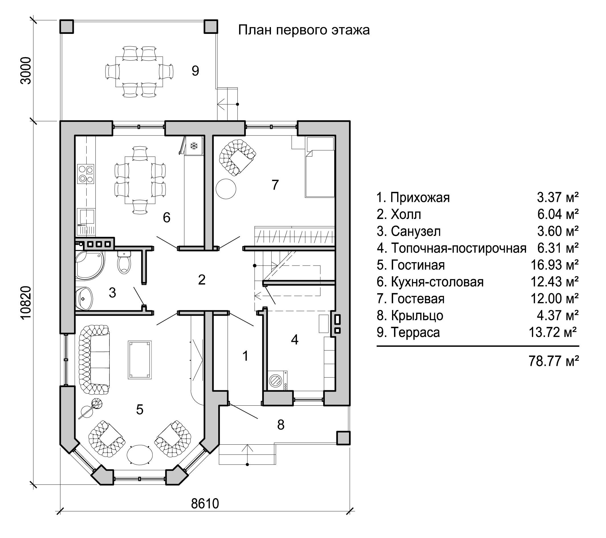 Есть большая площадь, где можно принимать гостей. Этого удалось добиться применением в проекте приема о смещенных помещениях, который был упомянут выше. Угловое размещение кухонного гарнитура позволило наилучшим образом использовать пространство, оставив его основную часть под гостиную и столовую. При таком разграничении в проекте потребуется хорошая звукоизоляция внутренних стен, т. к. звук телевизора и шум из кухни могут доноситься в спальню. Проект предусматривает наличие небольшой прихожей, которая одновременно выполняет роль воздушного тамбура для сохранения тепла в доме.