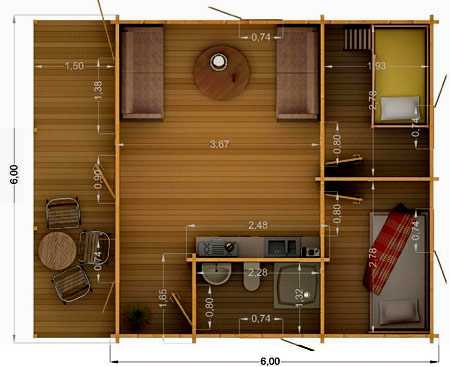 Вариант планировки одноэтажного дома 6х6 с террасой