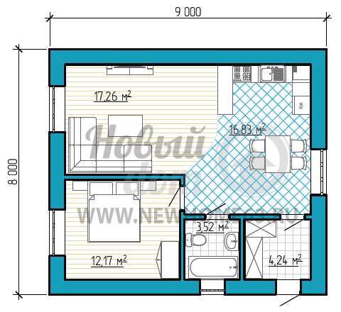 Планировка дома 8 на 9 м для проживания 2-3 человек с одной спальной, большим гардеробом, общей кухней-гостиной.