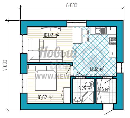 Планировка одноэтажного загородного дома 7 на 8 метров с большой комнатой студией