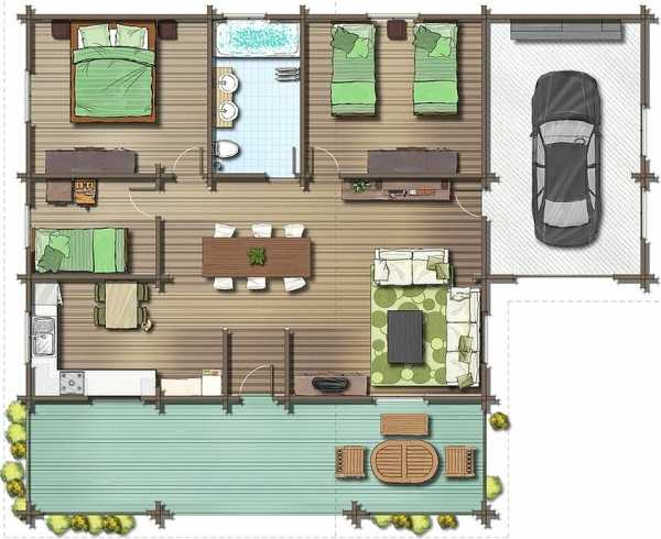По аналоги с предыдущим вариантом придется располагать и залу. В домике 8х8 можно поместить 2 комнаты для отдыха, зал, кухню и санузел. При этом все они будут вместительными. Если на участке имеется место для расположения веранды, то почему бы ее не сделать? Для тех, кто мечтает о большом количестве спальных комнат и огромной зале, стоит подумать про обустройство мансарды.