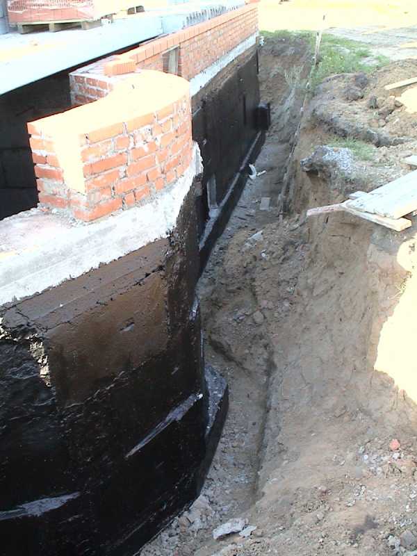 - Если между земляными стенами котлована и кирпичной кладкой есть место для проведения гидроизоляции, то по мере её прокладывания такое пространство нужно пролить водой и хорошо утрамбовать.