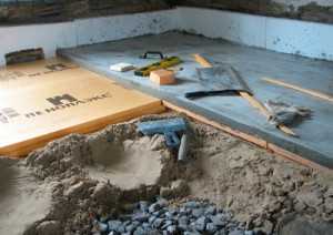 После устройства песчаной подушки (высотой до 20 см), укладки слоя щебня (толщиной в 10 см) и арматурной сетки из катанки (диаметром 0,6 см) пол в погребе заливают бетоном. При этом следует выдержать уклон основания в сторону технического приямка, предназначенного для сбора конденсата или на случай появления грунтовой воды.