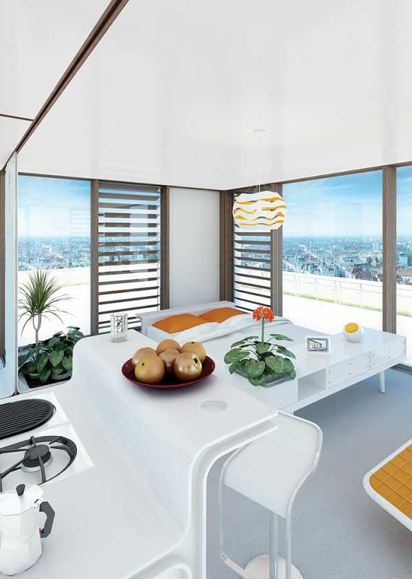 Данное жилище примечательно не только своей формой, но и по большей части тем, что может быть расположено в любой части города. На крыше небоскреба, среди многоэтажных зданий – не проблема расположить дом, созданный фирмой LoftCube. Такое произведение со стороны похоже на квадратную летающую тарелку в стиле модерн или хай-тек. А внутренний интерьер этого пространства только усиливает сложившееся ощущение. Пространство небольшое, всего 36 квадратных метров, но на этой площади помещаются все необходимые жилищные элементы, украшенные «зелеными островками». А вид из панельных оконных блоков, будет дарить незабываемые ощущения своим хозяевам, особенно если дом расположен на крыше небоскреба.