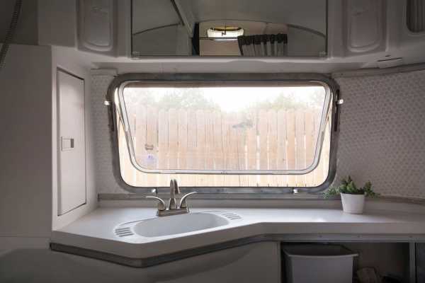 Такое передвижное жилище украсит даже маленький участок. Незамысловатый дворик обрамлён гирляндой электрических лампочек. Здесь, на свежем воздухе, можно разводить костёр и устраивать барбекю. Внутри фургон настолько красив и уютен, что хочется там остаться жить навсегда. Белые стены делают пространство визуально шире. С четырёх сторон окна, что позволяет вливаться в помещение солнечному свету и создавать уют. На небольшом сером диванчике можно предаваться любимым занятиям. Небольшая встроенная книжная полка совсем не занимает общей площади.