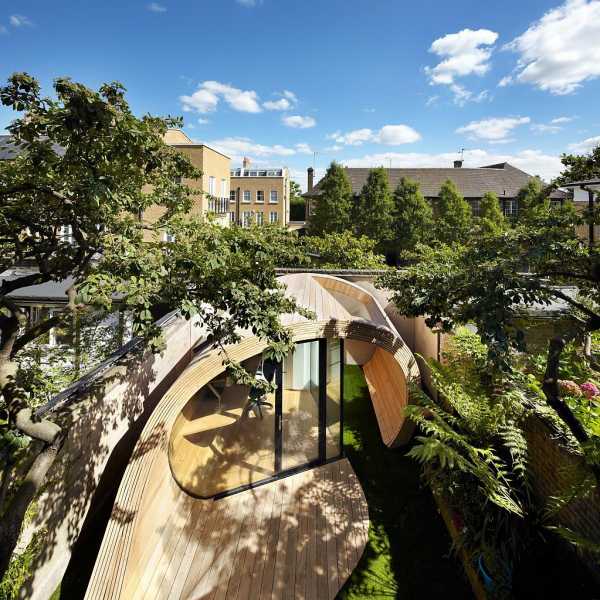 Shoffice вероятно, задуман дизайнерами как скульптурный объект, иллюзорно перетекающий в садовый участок. По большей части это строение напоминает гигантскую стружку и представляет собой эллиптической формы остекленнуюоболочку, выполненную из экструдированной древесины, что не позволяет самому материалу сжиматься. Деревянная стена плавно «перетекает» в небольшую террасу, освещение добавляет тепло в общую картину.