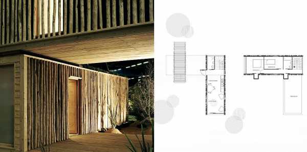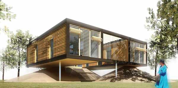 Этот дом не похож также на традиционные формы домов. Дом на подпорках представляет собой, взгромоздившиеся друг на друга прямоугольные жилые блоки, которые подпирает бревенчатая поленница. Обшивка дома выполнена из тонких бревен. Оконные проемы занимают меньшую площадь прямоугольного блока. На крыше такого дома расположены солнечные батареи, обеспечивающие жилище теплом и электроэнергией, а также водозаборы для обеспечения дождевой водой на технические нужды. Практичность, эргономичность, нестандартность, естественность и простота – вот те качества, которыми можно смело охарактеризовать данное жилище. Такой дом прекрасно вписывается в природный ландшафт.
