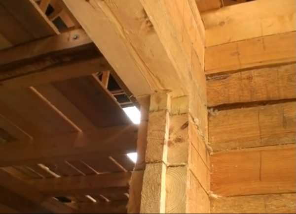 Возле оконных и дверных проемов устанавливаются нагели, во избежании перекосов стены. Через большие пролеты пропускают целый брус, который выпиливают только после усадки дома, перед установкой окон и дверей. Целый брус предотвращает неравномерную усадку или деформацию стены с большими проемами. После сборки стен сруба, сверху устанавливаются и закрепляются балки перекрытия.