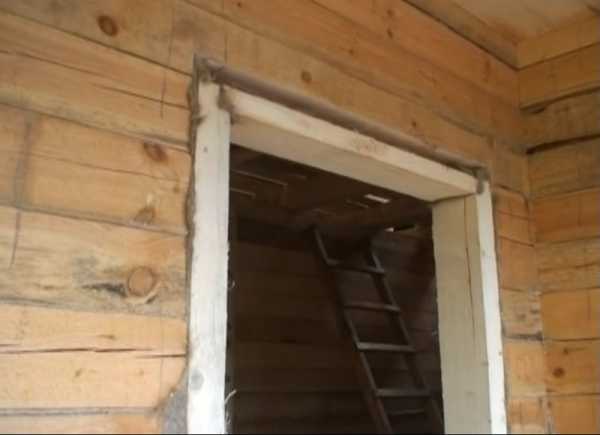 Между срубом и верхним косяком оставляют зазор 8-15 см, для усадки сруба, который заполняется мягким утеплителем (пакля, минвата). Верхний и боковые косяки могут скрепляться друг с другом, но не крепятся к срубу, чтобы не препятствовать его дальнейшей усадке.