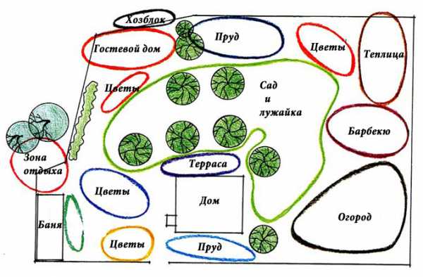 Кроме того, необходимо учитывать освещенность — дом можно будет построить и в затемненной части. А вот садово-огородную зону, теплицы и зону отдыха однозначно надо будет располагать в освещенной!