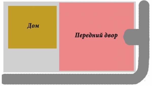 Центральная посадка дома — в этом случае, распределяется зона за домом (так называемый задний двор), потом дом и только потом передний двор. Благоустройство территории осуществляется в аналогичной последовательности.