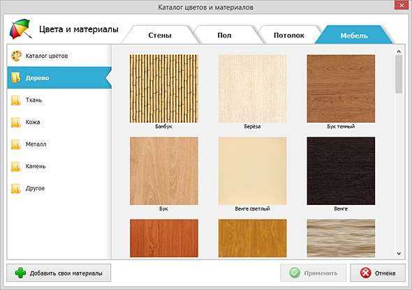 Для каждого предмета интерьера вы можете выбрать материал и цвет. Определите вид древесины для шкафов и столов, тип обивки для диванов, кресел и стульев. Настройка настолько детальная, что вы решаете, как будет выглядеть даже самый мелкий элемент, вроде дверной ручки.
