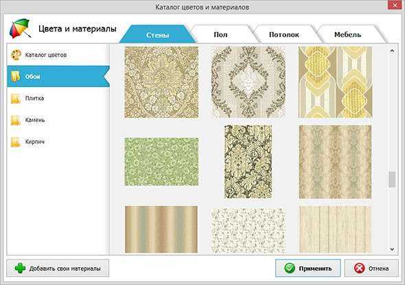 Так как в программе представлены наиболее распространённые покрытия, такие же или похожие нетрудно будет найти в специализированных магазинах. После того как вы определились с параметрами помещения, установили необходимые стенки, вы переходите во вкладку «окна».