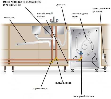Перед подключением надо заземлить посудомоечный агрегат, подключить сливной шланг к системе канализации и сделать врезку к трубе с холодной водой через установленный заранее вентиль. Проще всего обратиться к мастеру, который подключит посудомойку по всем правилам техники безопасности.