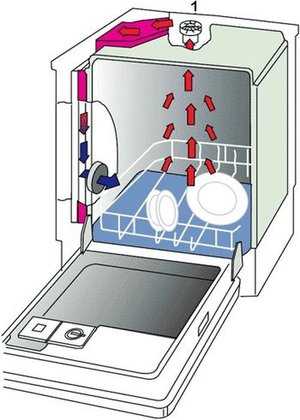 - Турбосушка. Воздух в камере нагревает специальный элемент, обдуваемый пропеллером. Горячий воздух наполняет посудомоечный отсек и очень быстро высушивает содержимое. Турбосушка применяется в дорогих устройствах.
