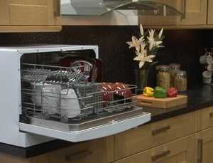 - портативные настольные посудомойки по размеру напоминают микроволновую печь, устанавливаются на кухонную столешницу и подключаются к крану. Хорошее решение для владельцев совсем маленьких кухонь.