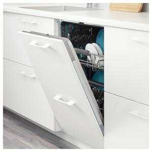 - встраиваемые посудомоечные машины монтируются в нижний ряд кухонных шкафчиков. Дверца устройства прикрывается фасадом, а все элементы управления располагаются на ее торце, т.е. для того, чтобы выставить все настройки, необходимо обязательно откинуть дверь. Понять, что за одним из фасадов скрывается встроенная посудомойка, невозможно. В этом и заключается основной плюс данного способа монтажа – кухня выглядит гармоничной и целостной. К тому же, устройство занимает меньше места, да и уровень шума будет ниже. Выбирать данный вариант лучше в тех случаях, когда вы обустраиваете кухню с нуля и параллельно с машиной выбираете и кухонный гарнитур;