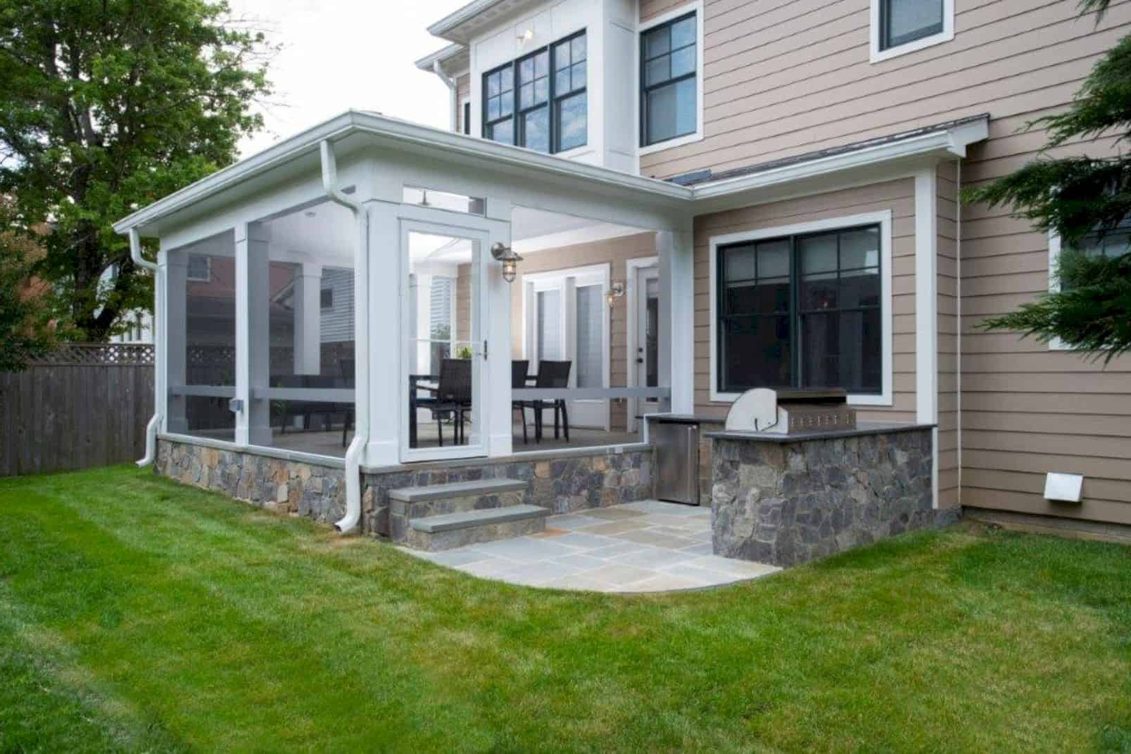 - Сочетающейся с домом и окружающим ландшафтом. Конструкцию возводят и отделывают, используя те же материалы, что и для основной части здания.