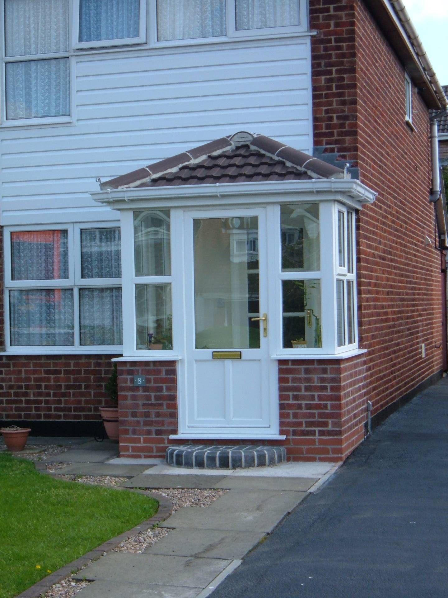 Удачный пример пластиковой входной группы с верандой