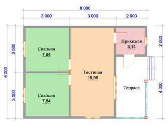 Небольшой участок вынуждает искать оптимальный вариант застройки, просматривая проекты одноэтажных домов. И в принципе, это отличное решение. Чтобы быть ближе к природе, есть смысл присмотреться к деревянным конструкциям. Небольшую внутреннюю площадь, в пределах 24 квадратов, с лихвой компенсирует просторная веранда, окружающая постройку, как минимум, с двух сторон. Экожилье можно выкрасить в желто-оранжевые тона и покрыть красной черепицей. Это создаст радостную атмосферу и не позволит домику затеряться в дебрях пышной садовой растительности.