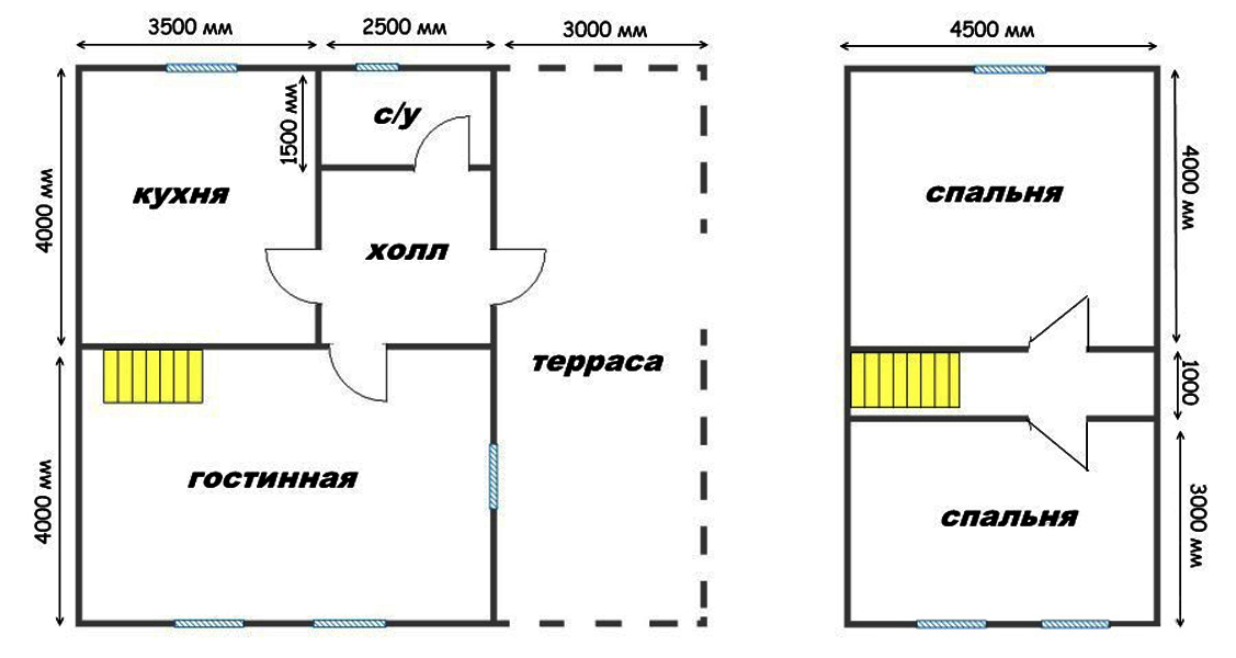 - Учитывайте расположение дверных и оконных проемов и отмечайте их на плане. Представьте, насколько освещены будут комнаты, удобно ли будет переходить из одной комнаты в другую. Еще один важный момент – расположение лестницы на второй этаж. Она может быть прямой или изогнутой, и важно, чтобы ступени не были слишком крутыми.