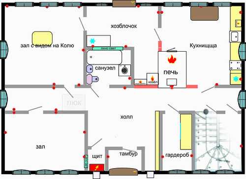 Чертеж такого дома может меняться в зависимости от требований пользователя. Но главное — печное сооружение должно стоять в самой середине жилища и быть встроенным во внутренние перегородки. Если и находится через стенку с общей комнатой, то его планировка такова, чтобы его мог обогревать угол печки. Профессиональные расчеты показали, что одна печь может успешно обогревать три помещения, расположенные вокруг нее.