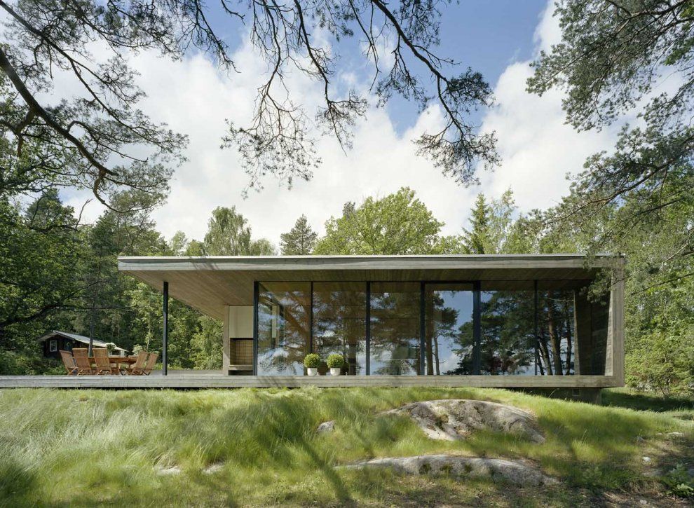 Кроме того, большая площадь остекления в конструкции небольшого дома с панорамными окнами влияет на качество инсоляции. Пространства получают много дневного света, остаются приятными для восприятия.