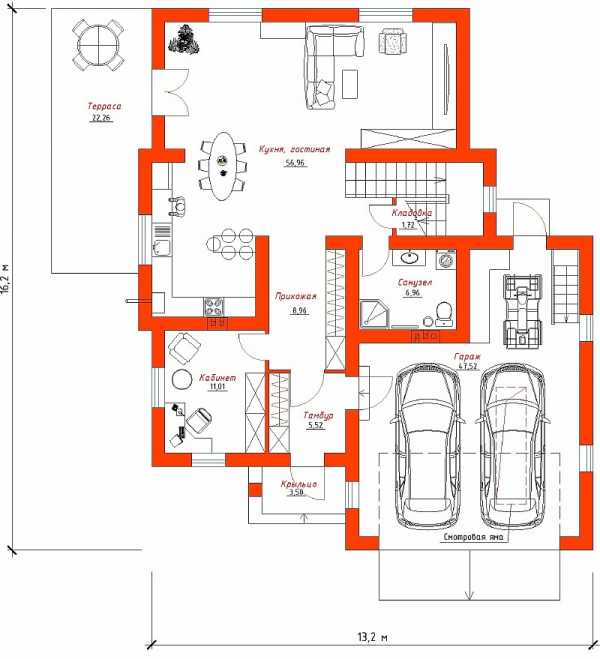 | Планировка 1-го этажа дома с гаражом на две машины |