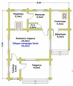 Планировка одноэтажного гостевого дома-бани 8х9 м