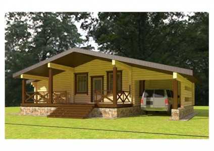 Проект одноэтажного гостевого дома-бани из бруса с навесом для автомобиляВ последнее время всё более популярными становятся проекты деревянных гостевых домов с баней. Причина такой популярности древесины заключается в экологичности и красоте, а также достаточно невысокой стоимости. Естественно, вы можете найти ещё более экономичные проекты гостевых домов с баней (например, из пеноблоков), но при этом они будут менее уютные, чем из бревна.