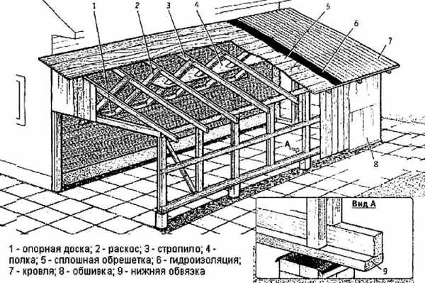 Стропила крепятся с одной стороны на верхнюю обвязку или мауэрлат. При этом используются металлические уголки или крепление «в узел» с предварительным раскроем посадочных гнезд. Со стороны дома на обвязку можно или просто поставить на ребро широкий брус, или установить его на стойки. На стропила натягивается гидроизоляционный материал (с небольшим провисом) и набивается обрешетка. Затем крепятся кровельные листы. Стык между кровлей пристройки и стеной здания можно заделать мастикой или запенить.