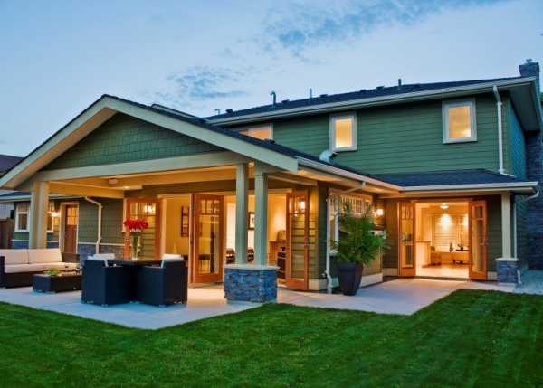 В виде каркасной пристройки можно сделать утепленную веранду, баню и даже комнату отдыха. Если деревянный дом поставлен на бетонный ленточный фундамент, в пристроенном помещении можно сделать огромные оконные проемы, превратить ее в студию или столовую комнату.