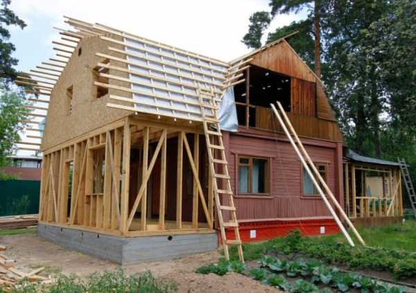 Для того чтобы построить новый скат, достаточно заменить старые стропила на новые, более длинные и тяжелые. Верхним концом стропильные балки опираются на вспомогательную коньковую планку мансарды, нижним запилом стоят на мауэрлате верхней обвязки пристройки.