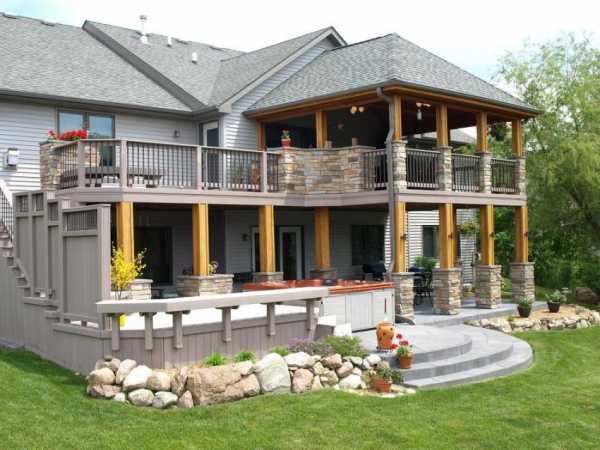 Пристройка террасы к деревянному дому, веранды или закрытого капитального сооружения, выполняется таким образом, чтобы их кровля располагалась чуть ниже основной крыши. Разумеется, угол между этими двумя конструкциями не должен быть отрицательным. Иначе в месте стыка будут скапливаться снег и вода.