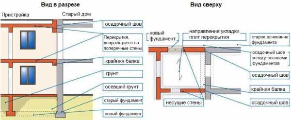 - Нужно правильно спланировать и сделать узел стыковки двух фундаментов. Мало построить дополнительное основание под пристройку, нужно еще сделать его безопасным, чтобы малый фундамент не стал причиной осадки или деформации стен;