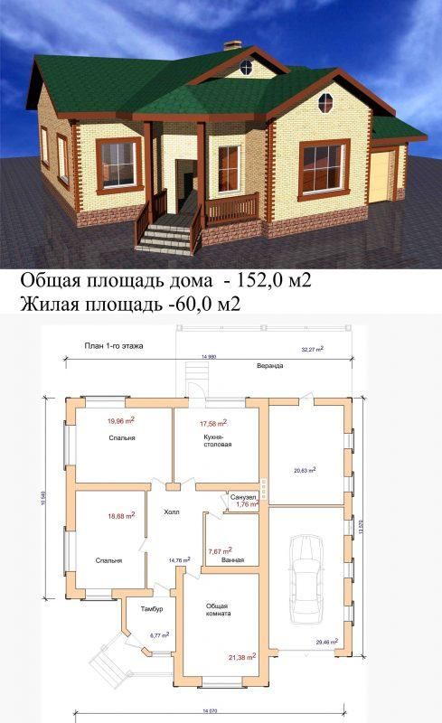 W-334-1K проект одноэтажного дома из кирпича с гаражом размером 20 на 30