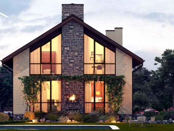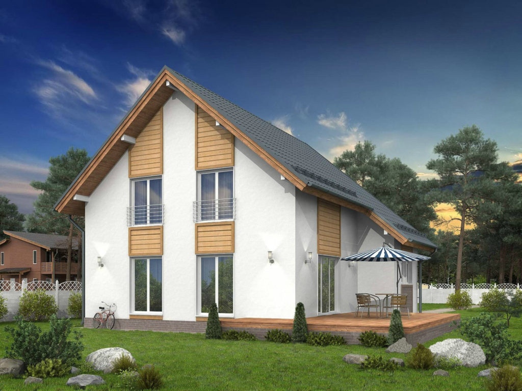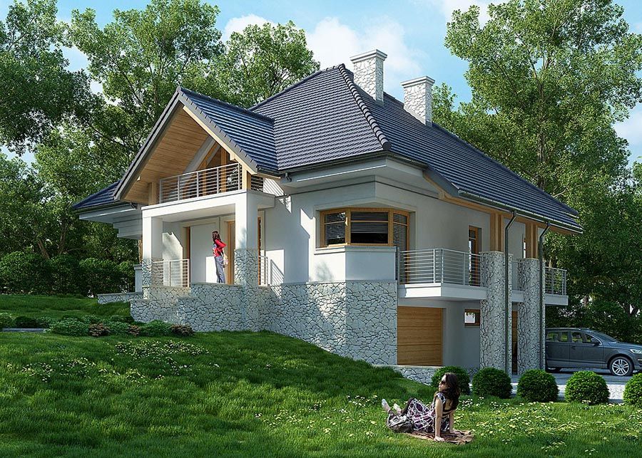 AS-2018 — проект двухэтажного дома из газобетона с мансардой и крыльцом