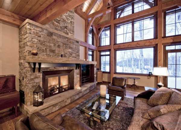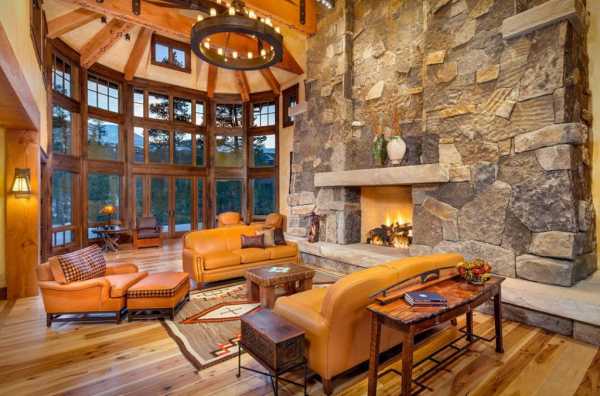 Для интерьера шале подойдет просторная комната с высокими потолками и панорамными окнами. Шкуры животных, массивная мебель и теплые ковры подчеркнут очарование стиля. Освещение может быть многоуровневым. Центральная люстра под старину (с имитацией свечей) будет создавать уют вместе с бра, настольными или напольными лампами с абажурами из натуральной ткани. Пример интерьера дома в стиле шале, фото просторной гостиной: