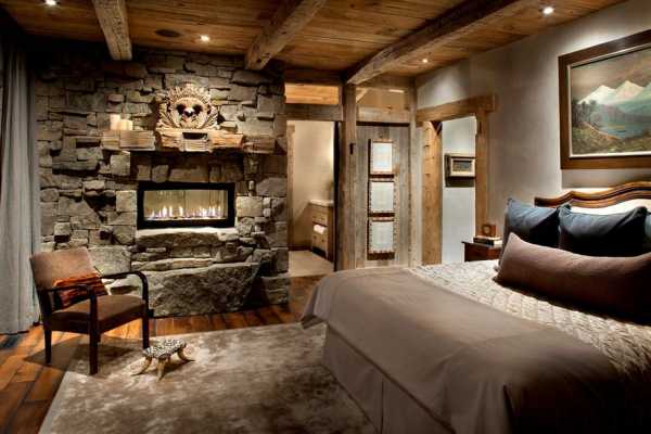 Камин — визитная карточка стиля, место фокусировки интерьера. Он устанавливается в гостиной, а то и в спальне, облицовывается камнем. Встречаются электрические камины, над которыми вполне естественно выглядят плазменные телевизоры.